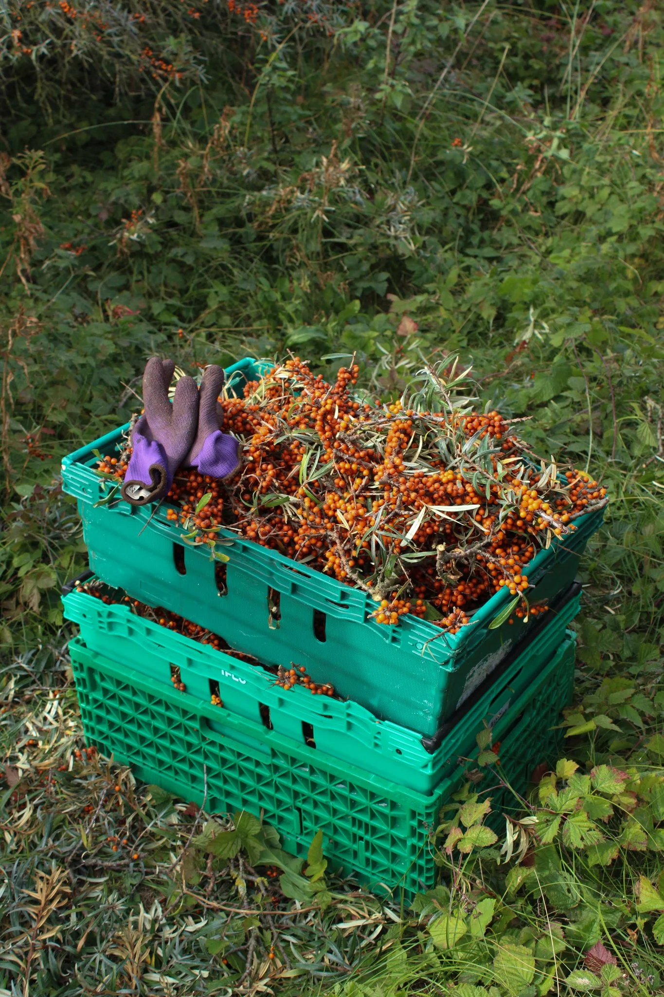 Monday saw the team head over to the Merseyside coast line for our annual sea buckthorn foraging expedition. This native species is found by sand dunes and is most noticeable Autumnal months when the bushes show off their hyper citrus fruits. We managed to get a decent amount whilst still leaving plenty behind, when they arrive at the restaurant, we freeze the branches which makes it far easier to remove the berries from their thorny stems. Sea Buckthorn has a flavour that matches the intensity of its colour, they also contain up to 16 times more vitamin C than an orange which is impressive due to the size discrepancy between the fruits.