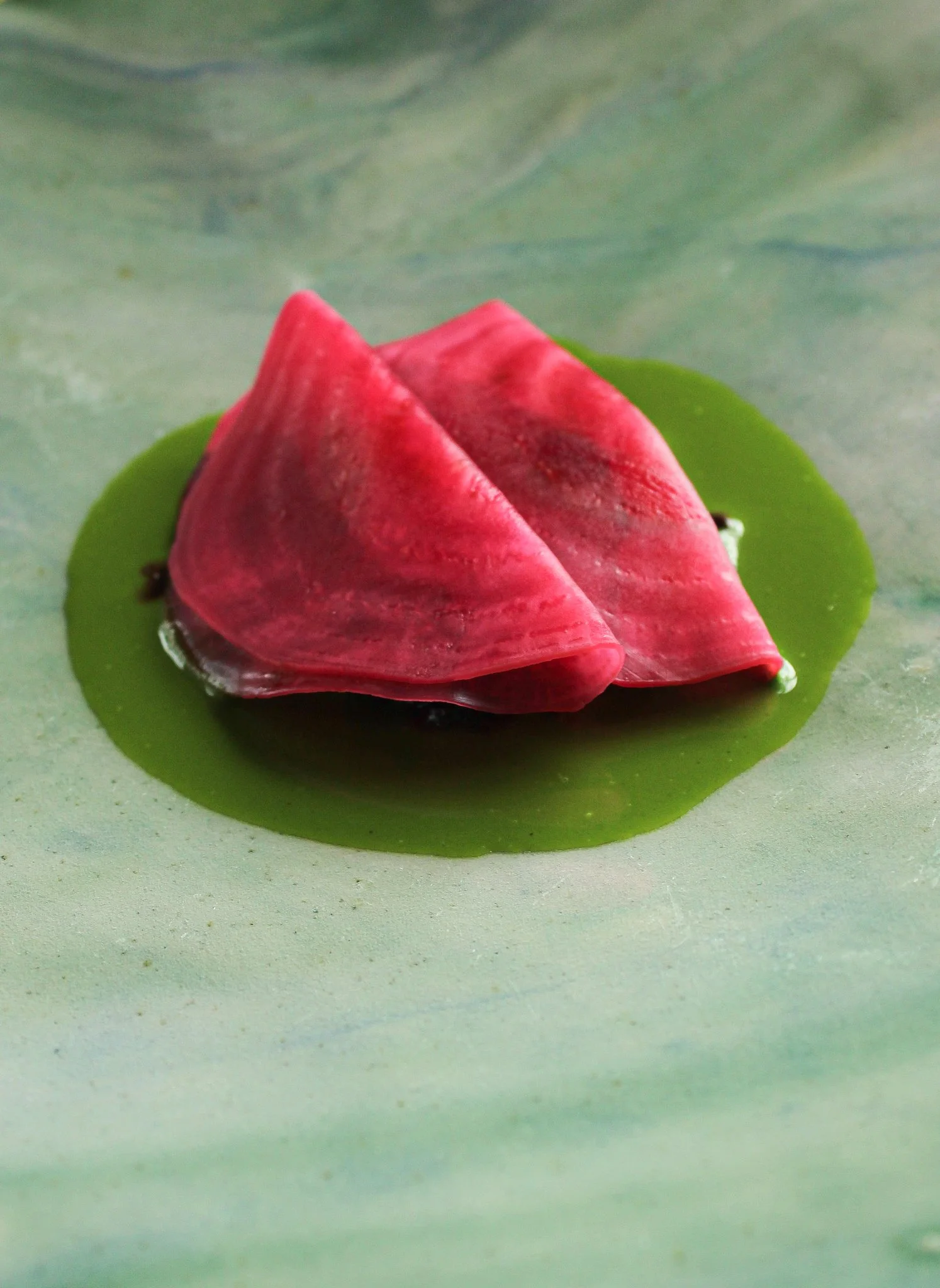 Beetroot ragu, minced raw, cooked in red wine and beet molasses. Watercress sauce with pickled Chioggia Beetroot.
