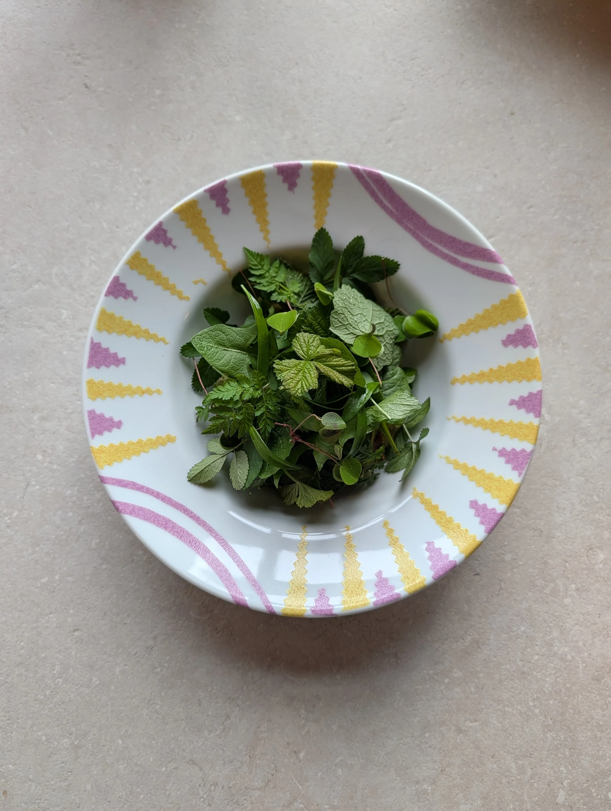 Dandelion, bistort, burdock, ground elder, wood sorrel, young ramps, Jack-by-the-hedge, blackberry bud, and bitter cress so far… through the season, the plants are bound to change.