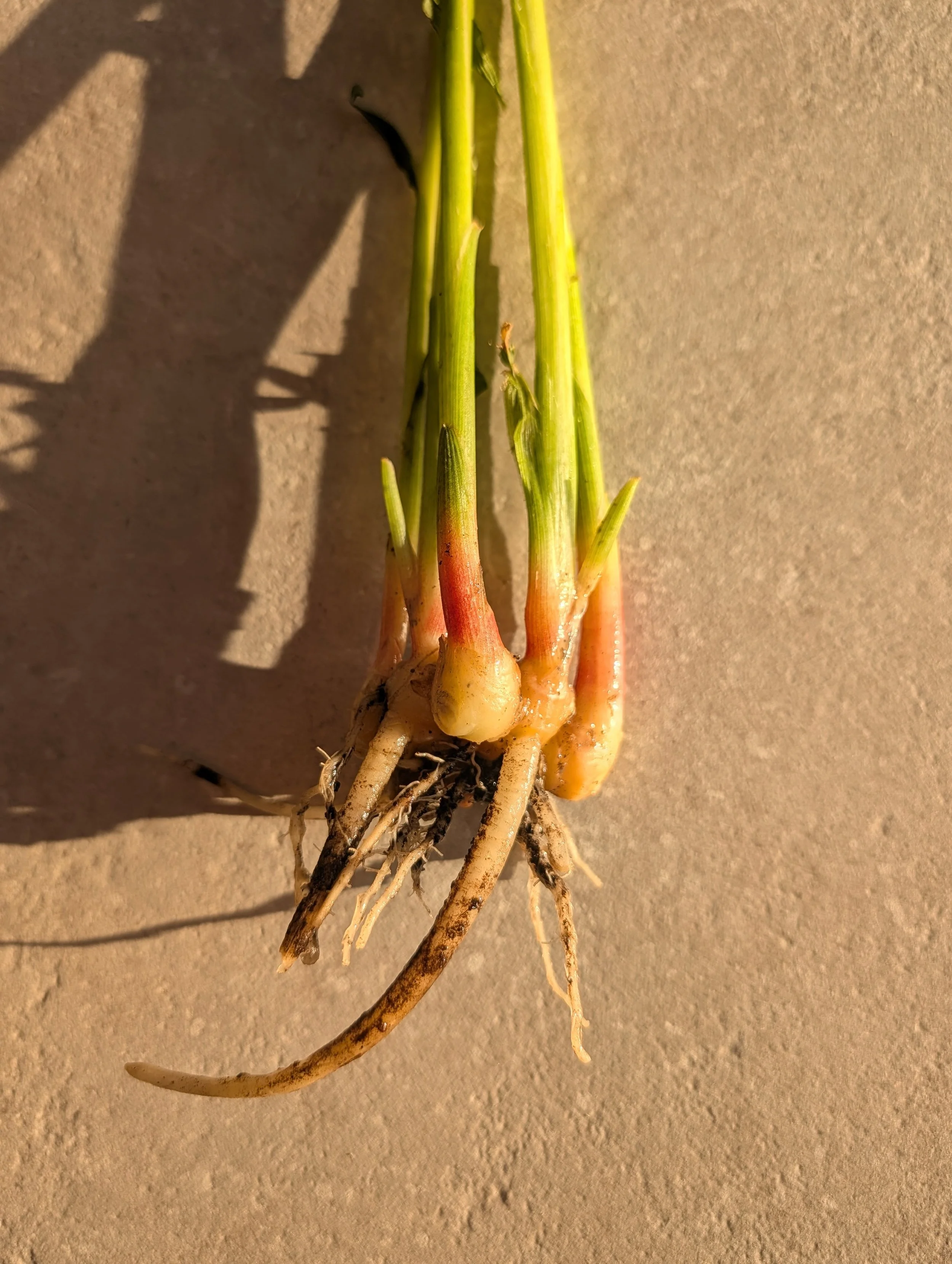 As well as this, Nathan is harvesting our first ginger. We planted it in the greenhouse in January. It is a rhizome, meaning it spreads its roots sideways under the soil, pushing up new shoots to flag its growth. We start with a selection of mother bulbs. They look like any ordinary ginger bulbs from the grocers. They are soaked in water overnight and then placed gently on the top of a light compost. We heat the sil with matts through January. Eventually, the bulbs offer new shoots, and that is when we transplant to the beds that are hooped with plastic sheets, sort of like a mini polytunnel. What we harvest is bright green tropical leaves and stems that lead to a neon pink bulb that blends into a succulent white root. It is, perhaps, my favourite-looking plant. And the raw bulbs slice finely, have the crispness of a green apple with a delicate and floral zing on the tongue.